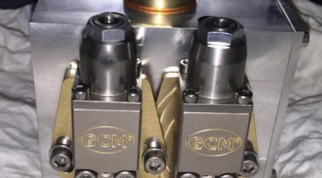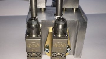 Auftragskopf GC402 in kompakter Bauweise mit zwei schwenkbaren Auftragsventilen und einzelne pneumatische Ansteuerung der Auftragsventile und integriertem Filter.