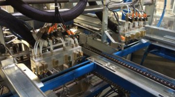 Auftragskopf GC106 mit sechs Auftragsventilen der Ausführung „Mini“ und einzelne pneumatische Ansteuerung der Auftragsventile. hier in eingebautem Zustand bei einem Kartonaufrichter vom Typ TeCo.